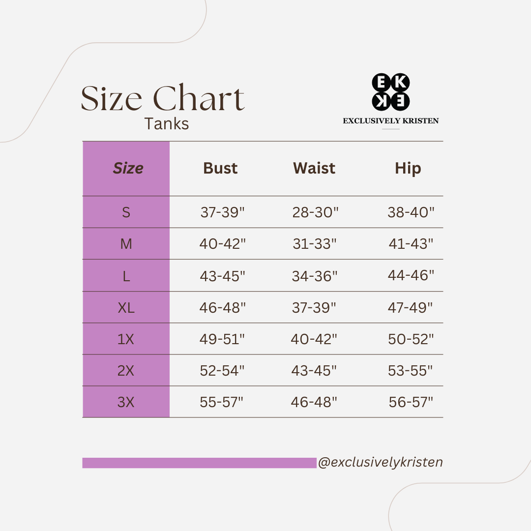 Exclusively Kristen’s tank tops are made to provide breathability and freedom of movement. With less fabric around the arms and chest, they allow for better airflow, making them especially comfortable in warm weather. Made from 95% cotton with a touch of stretch, they’re soft against the skin and offer an easy, unrestricted fit for all-day comfort.